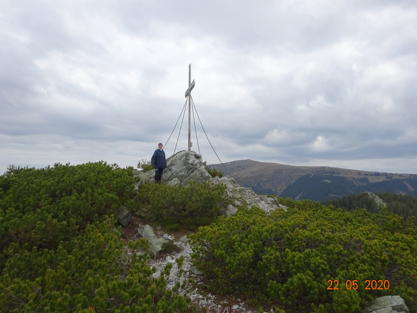 Bald verließen wir den markierten Weg und hielten uns jetzt rechts, um unseren ersten Gipfel, den 1.539m hohen kleinen Pfaff zu erreichen. Und nach einer knappen dreiviertel Stunde standen wir bereits beim Gipfelkreuz.