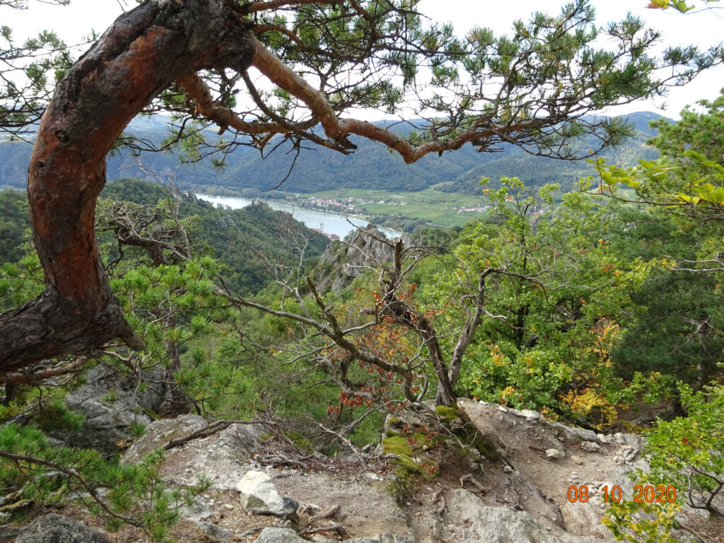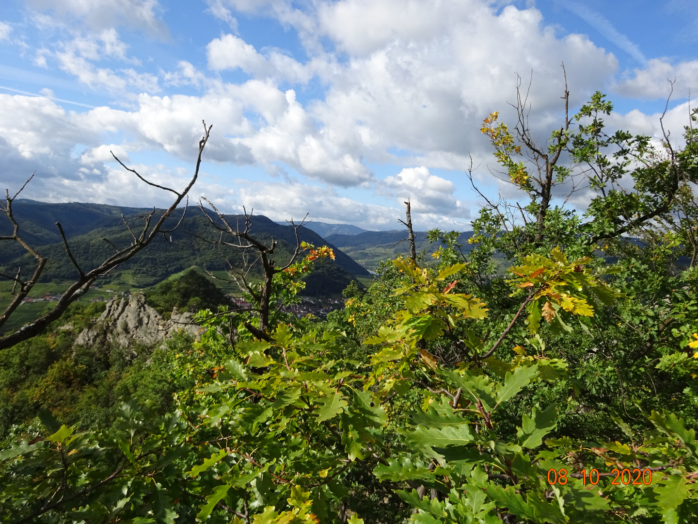 Schon im Frühjahr war ich in der Wachau unterwegs und war überrascht wie alpin es hier ist. Also ging es dieses Mal über den Vogelbergsteig auf den Vogelberg. Ich starte in Dürnstein und mußte nicht lange suchen um den richtigen Weg zu finden. Erst ging es ein paar Hundert Meter durch den Ort auf Asphalt bergauf. Bald endet die Asphaltstraße und im Wald geht es jetzt ein Stück auf einem breiten Weg weiter. Nicht lange und ich stehe vor einer Gabelung. Gerade weiter kann ich durch den Talgraben aufsteigen, aber ich entscheide mich für den Vogelbergsteig und halte mich links. Jetzt auf einem schmalen Steig und Felsendurchsetzt geht es in Serpentienen immer weiter rauf. Bald kann ich einen Blick runter zur Donau und nach Dürnstein mit seiner Ruine riskieren. Trotz der geringen Höhe wird der Steig immer alpiner und felsiger. Bald befinde ich mich am Vogelbergsteig, der als leichter Klettersteig (A) bewertet ist. Aber für mich ist das nur ein Wandersteig mit einigen Seilsicherungen, der auch ungeübten keine Probleme bereiten sollte. Allerdings, ein wenig Kondition sollte am schon mitbringen, da es doch über eine Stunde steil bergauf geht.