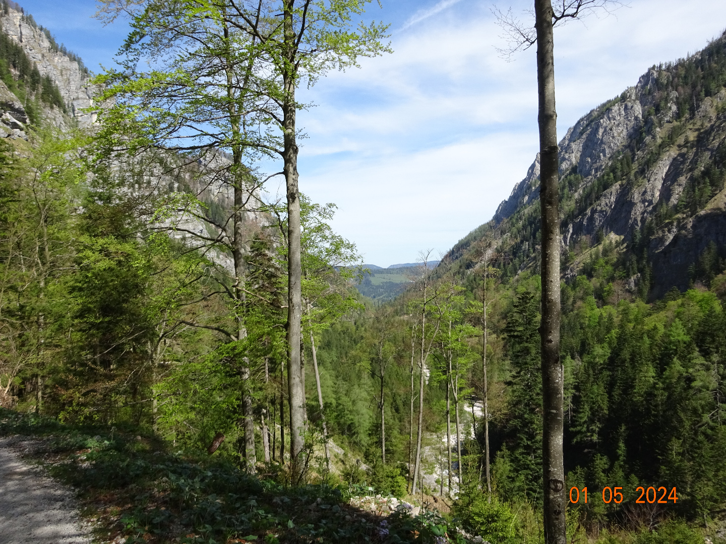 Eineinhalb Stunden nach meinem Start war ich beim Mittersee auf 766m. Ein wirklich schöner Bergsee. Aber ich wollte ja auch noch zum Obersee. Also ging es weiter. Auch für den weiteren Weg mußte ich auf der Forststraße marschieren. Einziger Unterschied zu vorher war, dass der Weg jetzt steiler wurde. Weit unter mir hörte und sah ich den Seebach. Neben Felswänden ging es jetzt stetig bergauf. Das Rauschen des Baches wurde lauter, und bald wußte ich warum. Nicht weit weg sah ich den Ludwigfall, einen imponsanten ca. 60m hohen Wasserfall.
