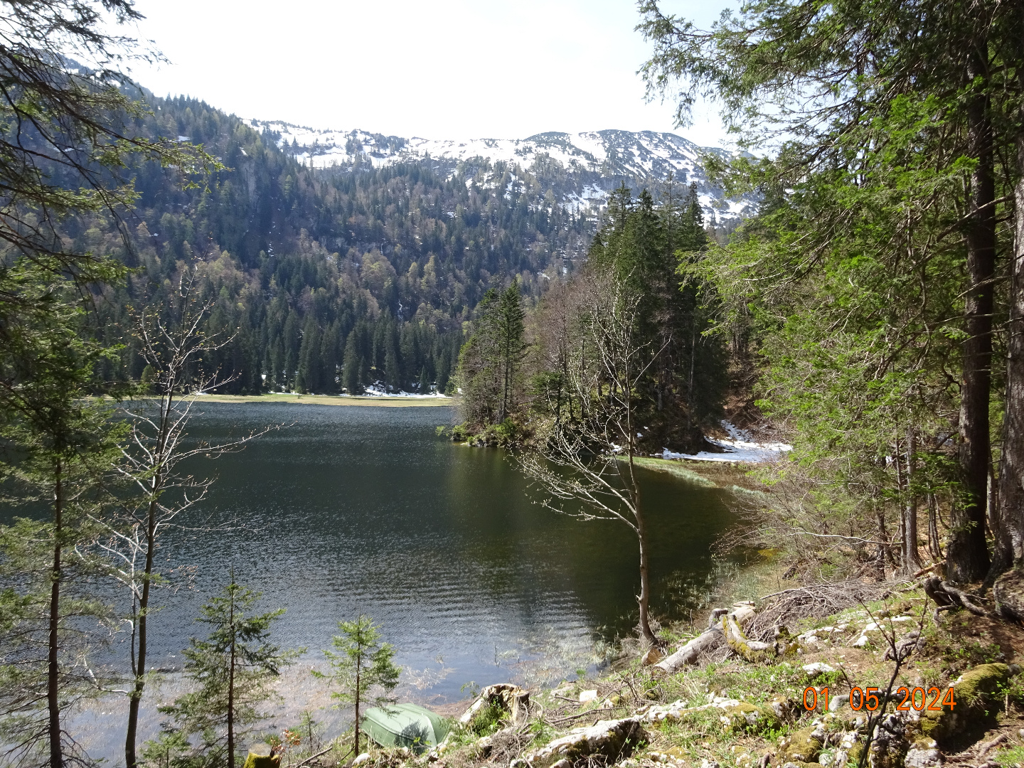 Noch ein Stück bergauf und eine Stunde nach dem Mittersee stand ich beim Obersee auf 1.114m. Tatsächlich ist das ein idyllischer Platz. Ein herrliches Bild: das dunkle Wasser des See, in der Mitte eine kleine Insel und auf der Südseite der Dürrenstein auf dem noch die letzten Schneereste liegen.