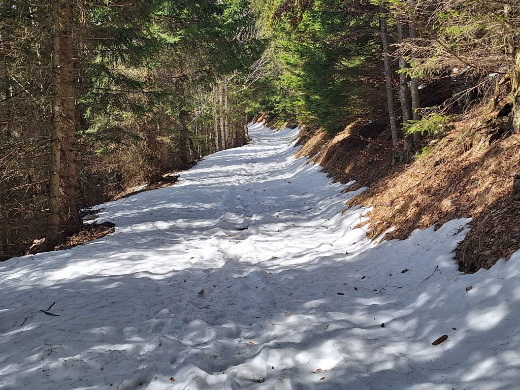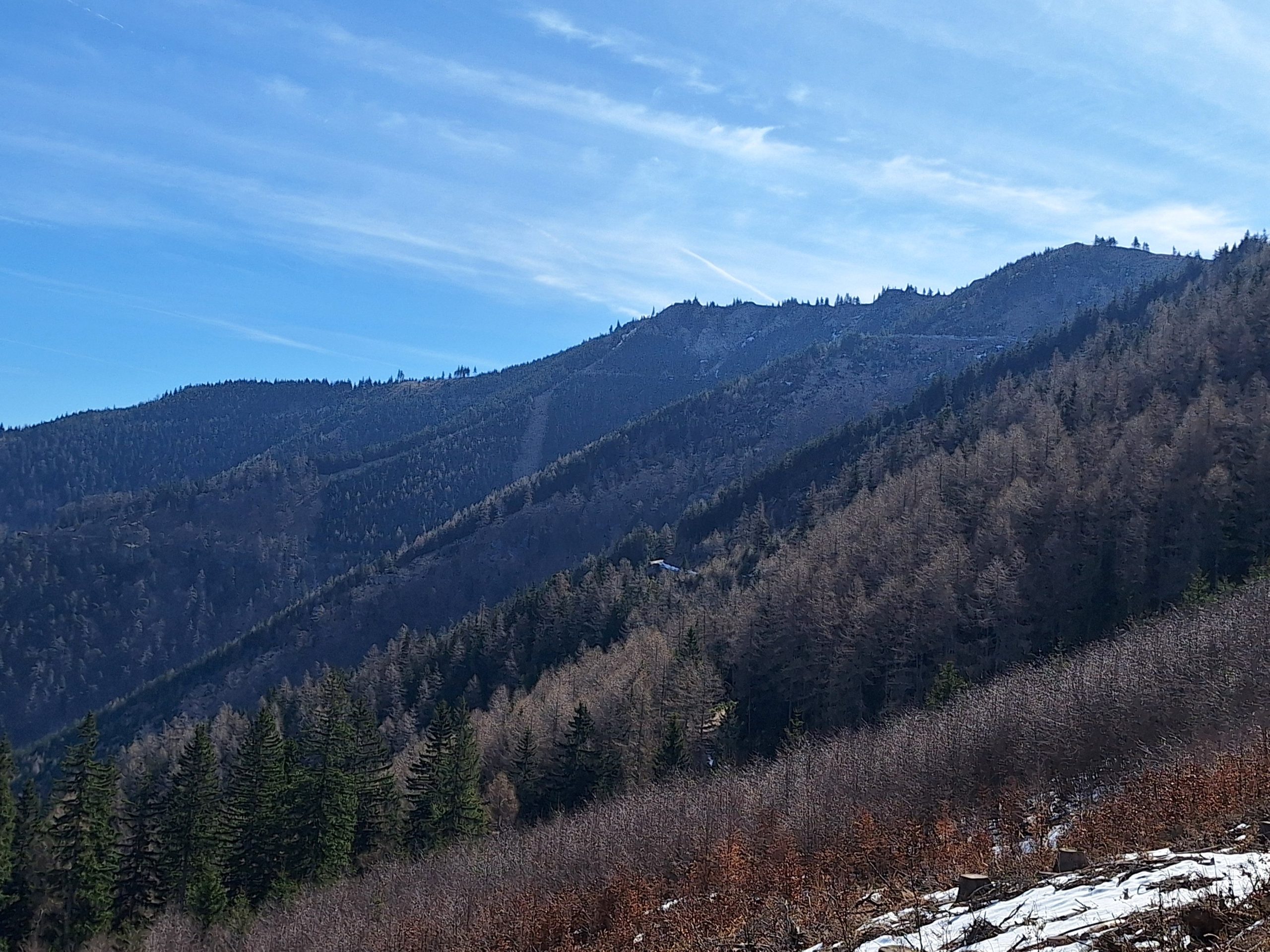 Nach einer ausgiebigen Pause ging es wieder zurück. Jetzt nicht über den Gipfel, sondern am markierten Wanderweg. Das erste Stück im Wald, wo ich noch durch Schnee stapfen durfte. Nach einer knappen halben Stunde am flachen Wanderweg bin ich wieder am Blochboden, von wo ich den Steig, den ich schon vom Aufstieg kenne für den restlichen Abstieg nehme.
