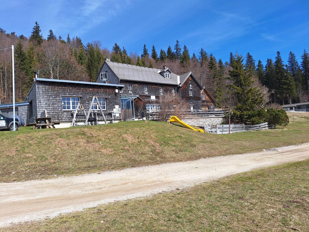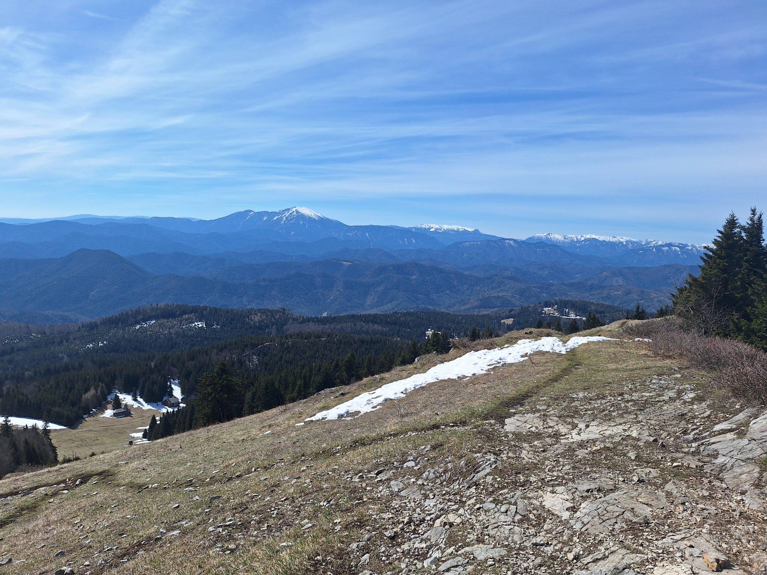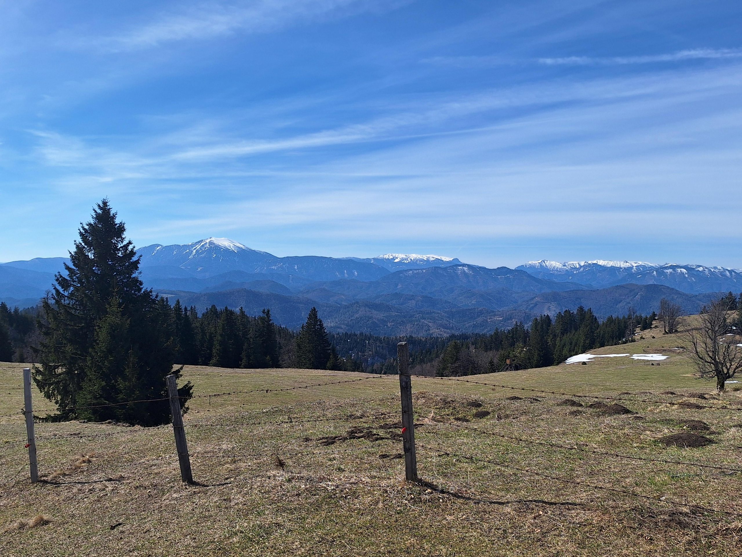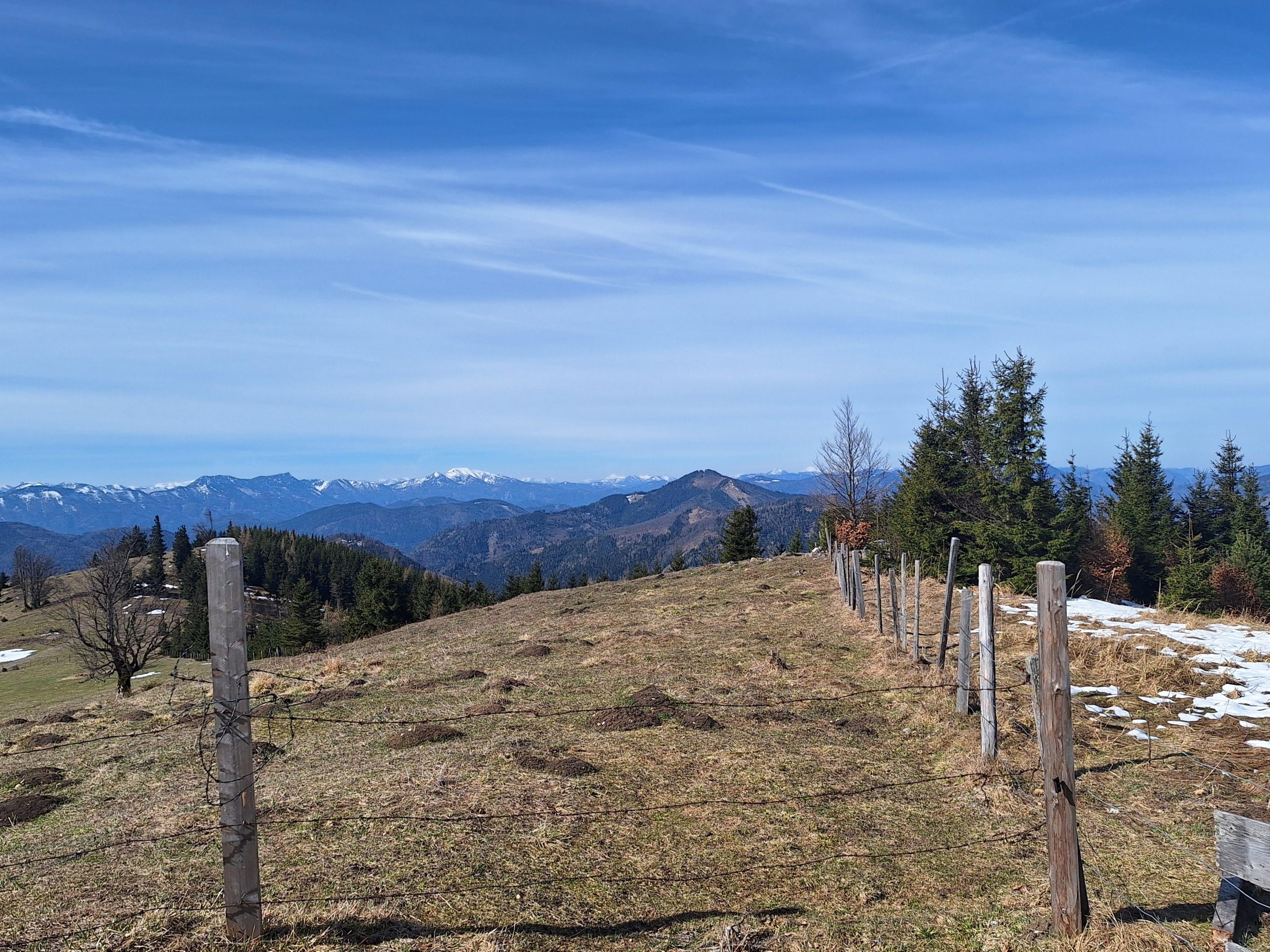 Etwa 1,5 Stunden nach dem Start war ich endlich am Blochboden, einer großen Almwiese, von wo die Fernsicht schon super war. So konnte ich bereits zu Schneeberg, Schneealpe, Ötscher und Hochschwab sehen.