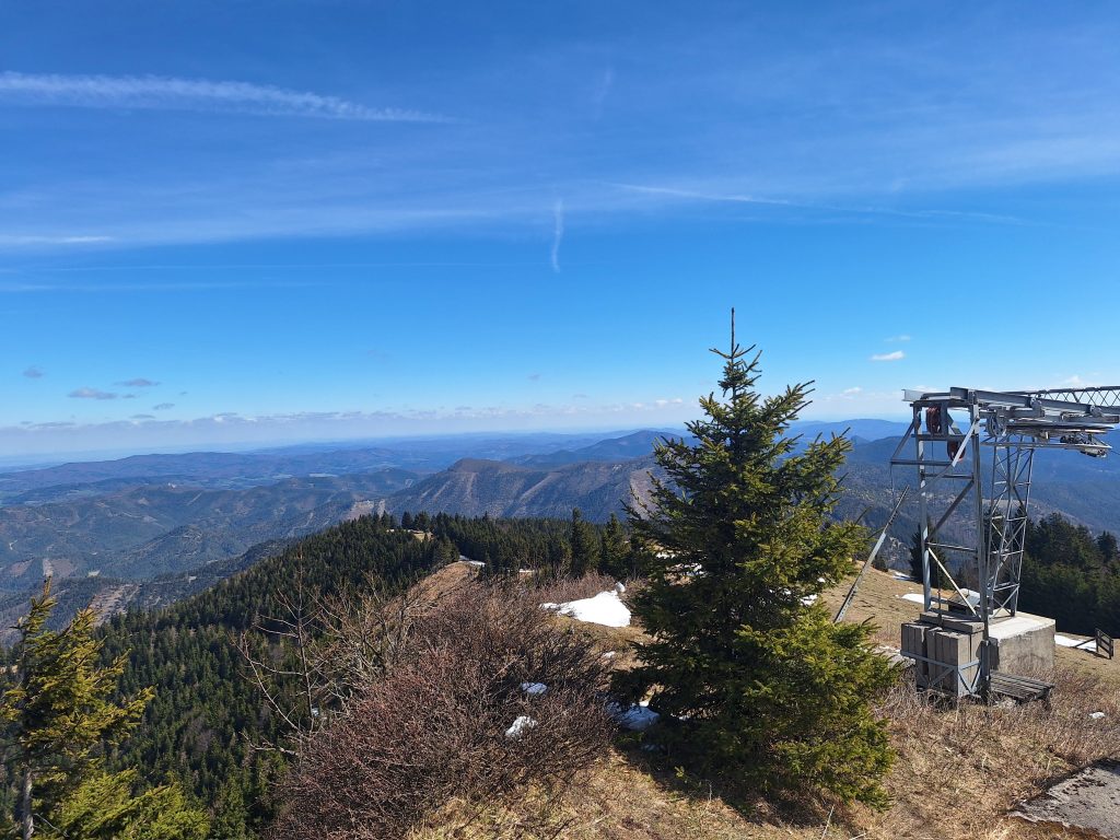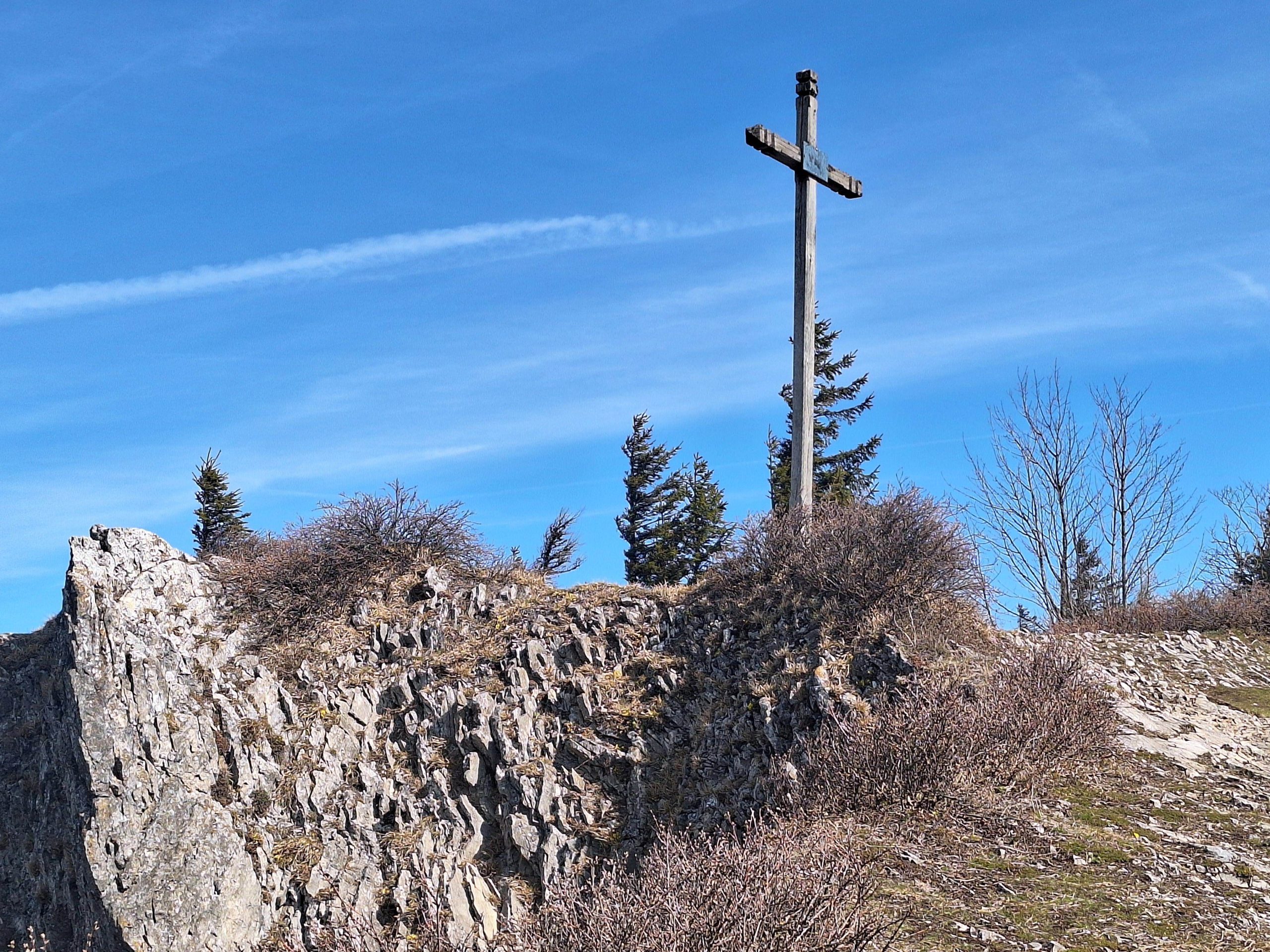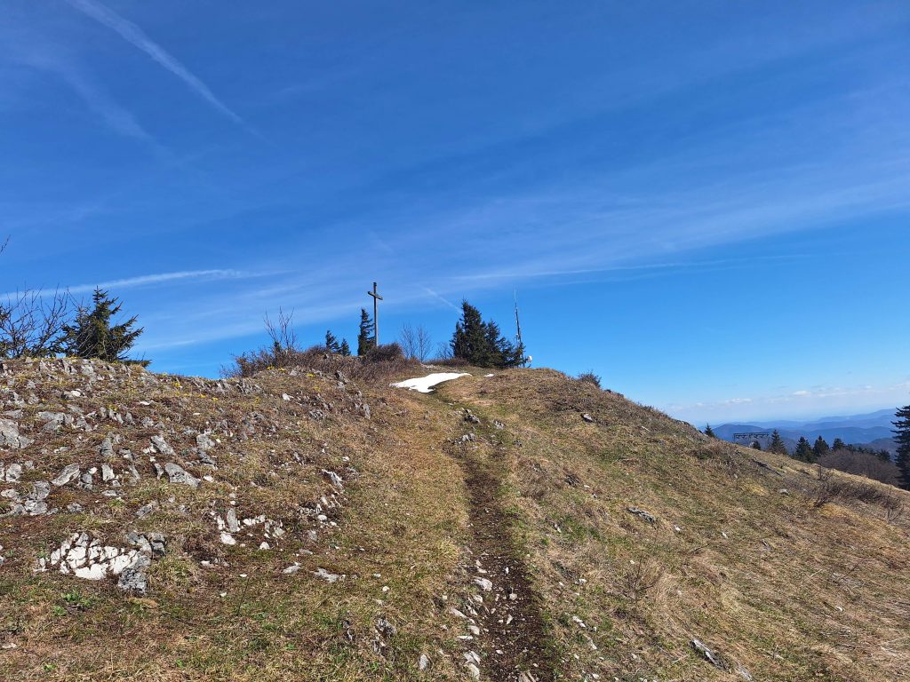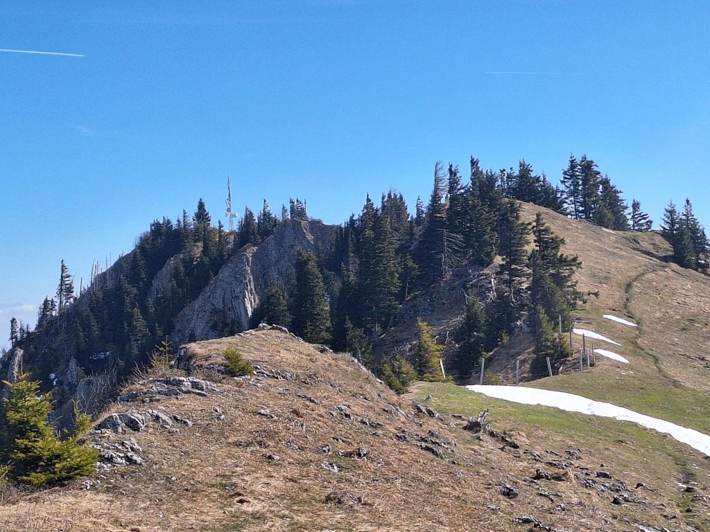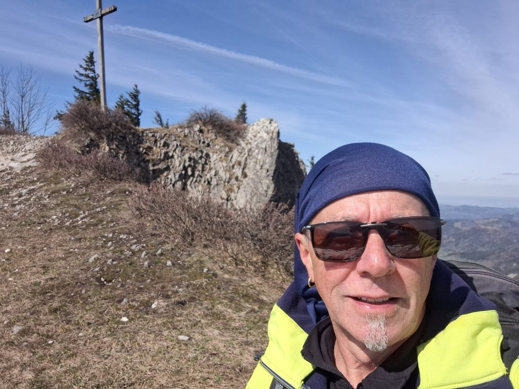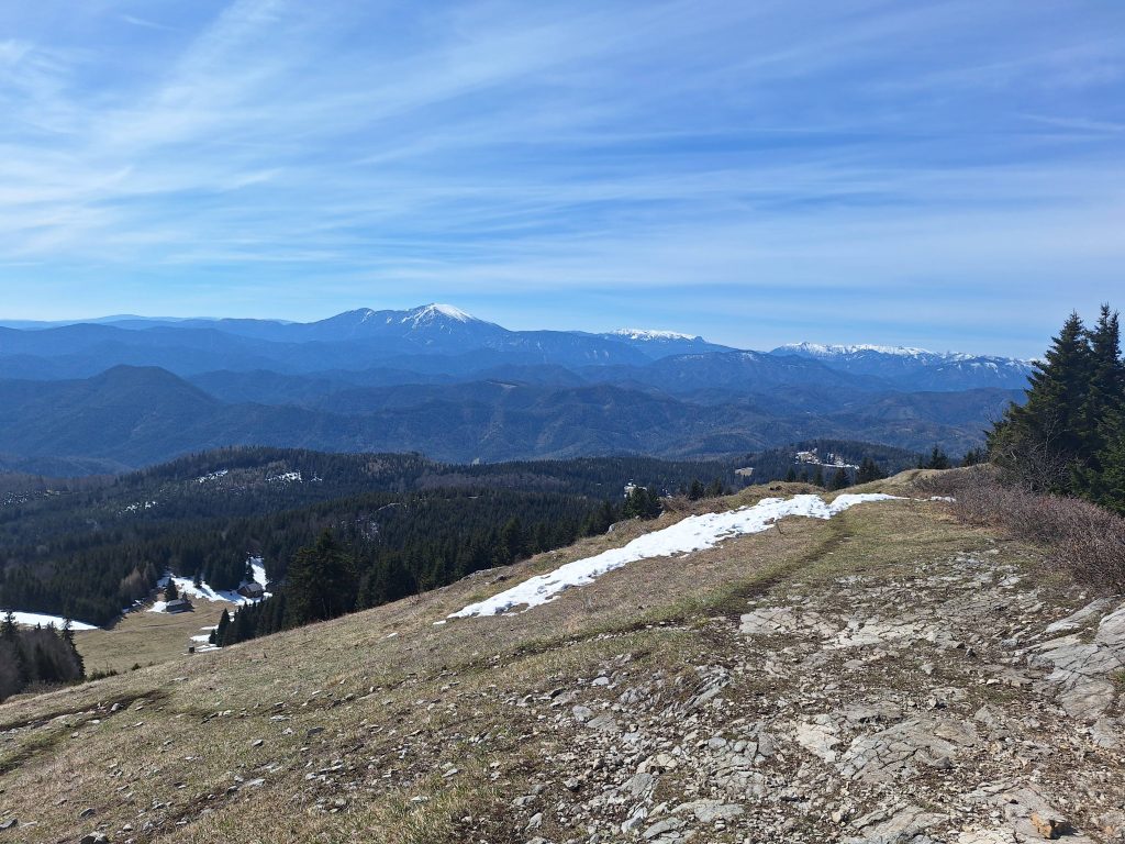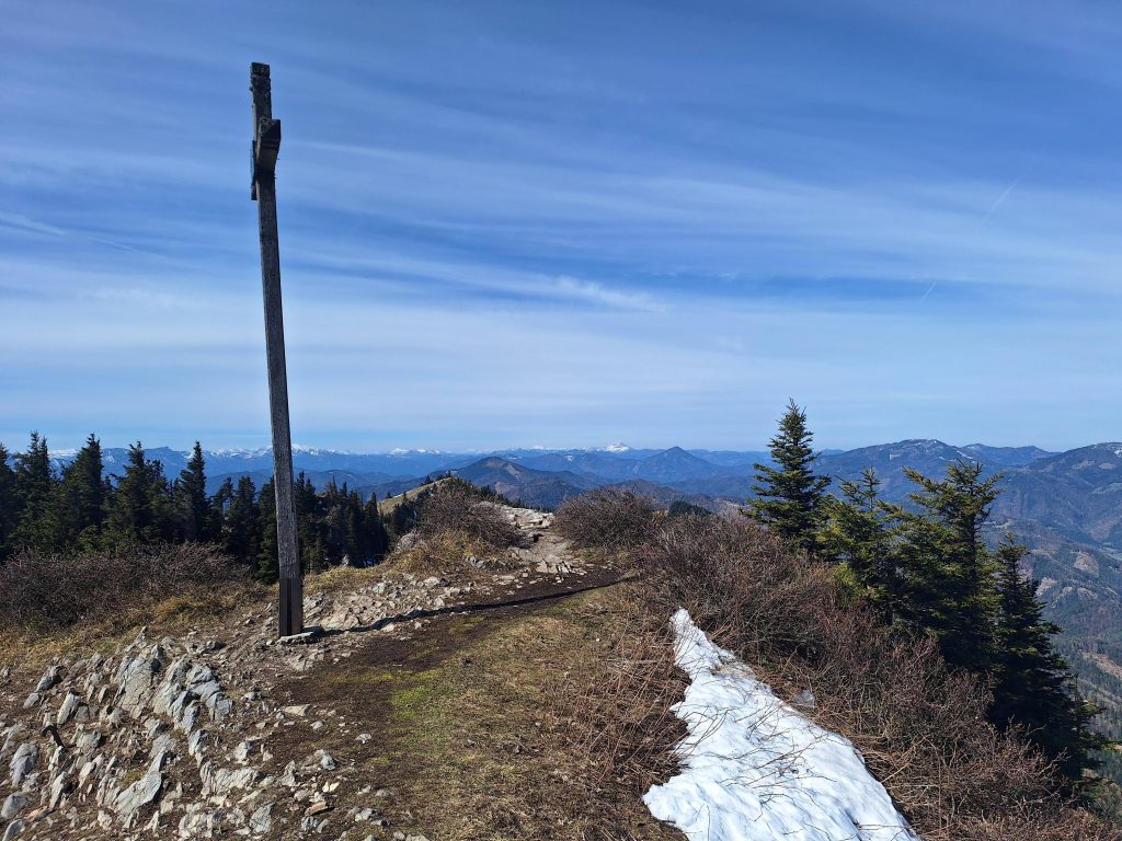 Zwei Stunden nach dem Start war ich beim Gipfelkreuz. Herrliche Fernsicht. Die schneebedeckten Berge die ich schon vom Blochboden sah auf der einen Seite, Richtung Osten war ganz schwach der Neusiedlersee und die Hochhäuser von Wien zu erkennen. Auch in nördliche Richtung war der Blick gut.
